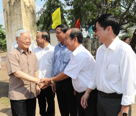 | Le secrétaire général du PCV, Nguyên Phu Trong (gauche), et des habitants de la commune en difficulté particulière d’Ayun, province de Gia Lai (hauts plateaux du Centre), le 12 avril. |