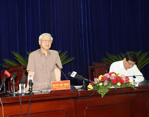 | Le secrétaire général du PCV, Nguyên Phu Trong (debout), lors d'une séance de travail avec les autorités de Bac Liêu, le 20 février dans cette province méridionale. |