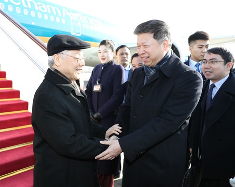 | Le secrétaire général du PCV Nguyên Phu Trong est accueilli à l'aéroport de Pékin. |
