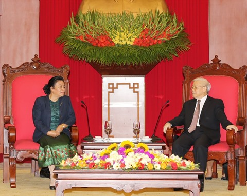 | Le secrétaire général du PCV Nguyên Phu Trong et la présidente de la Commission des relations extérieures du PPRL, Sounthone Sayachak, en visite de travail au Vietnam. |