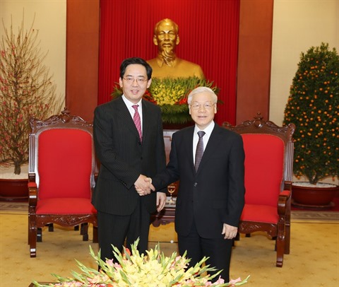 | Le secrétaire général du PCV, Nguyên Phu Trong (droite), et l’ambassadeur de Chine au Vietnam, Hong Xiaoyong, le 8 février à Hanoï. |