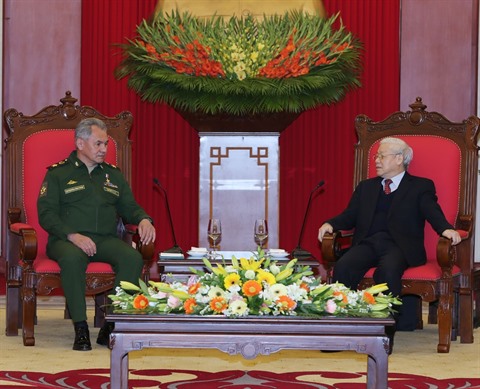 | Le secrétaire général du Parti communiste du Vietnam, Nguyên Phu Trong (à droite) et le ministre russe de la Défense, Sergueï Choïgou, le 23 janvier à Hanoi. |