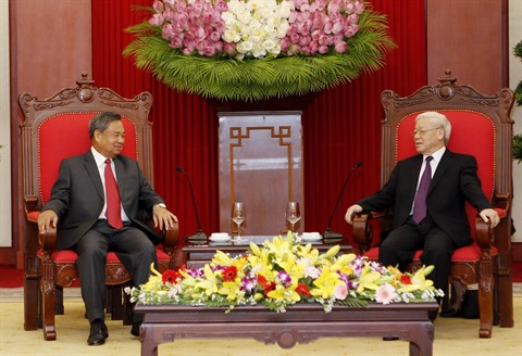 | Chansy Phosikham (gauche), membre du Politburo et chef de la Commission d'organisation du CC du PPRL reçu le 22 mai à Hanoï par le secrétaire général du PCV, Nguyên Phu Trong. |