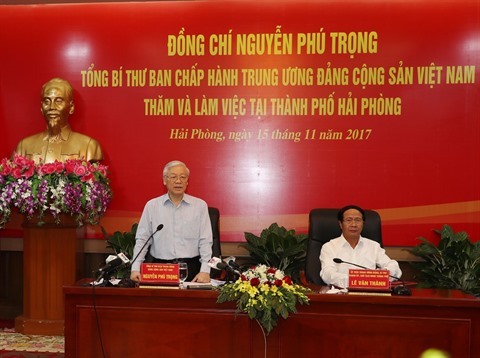 | Le secrétaire général du PCV, Nguyên Phu Trong, s'exprime lors d'une séance de travail, le 15 novembre à Hai Phong. |
