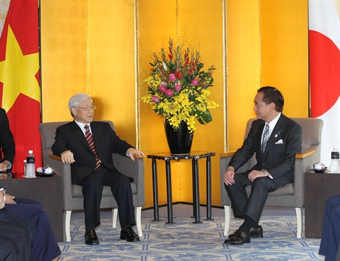 | Le secrétaire général du PCV, Nguyên Phu Trong (gauche), rencontre le gouverneur de la Préfecture japonaise de Kanagawa, Kuroiwa Yuji, le 18 septembre. |