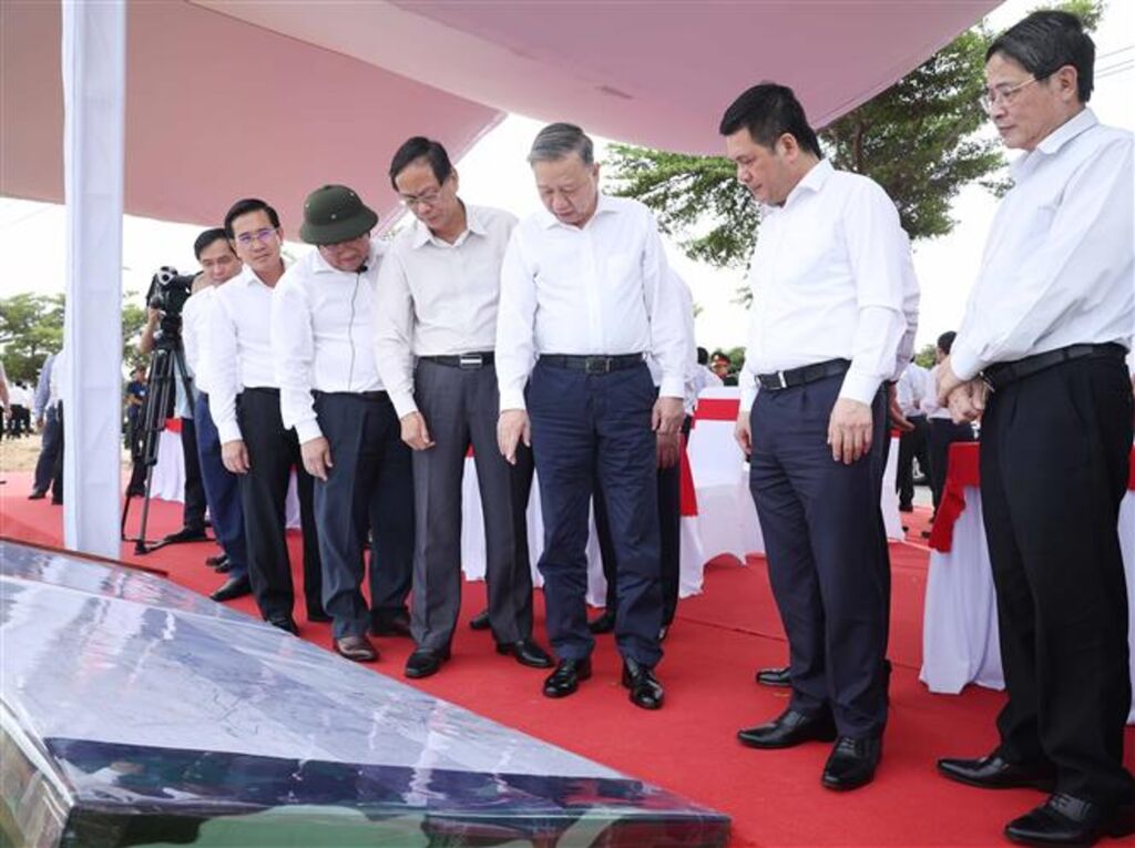 | Le secrétaire général du PCV, Tô Lâm (3e à droite), observe les lieux de construction de la centrale nucléaire de Ninh Thuân 1. |