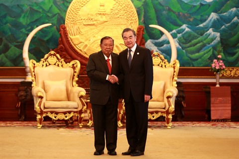 | Le président laotien Bounnhang Vorachith (droite) et le conseiller d'État chinois et ministre des Affaires étrangères Wang Yi. |