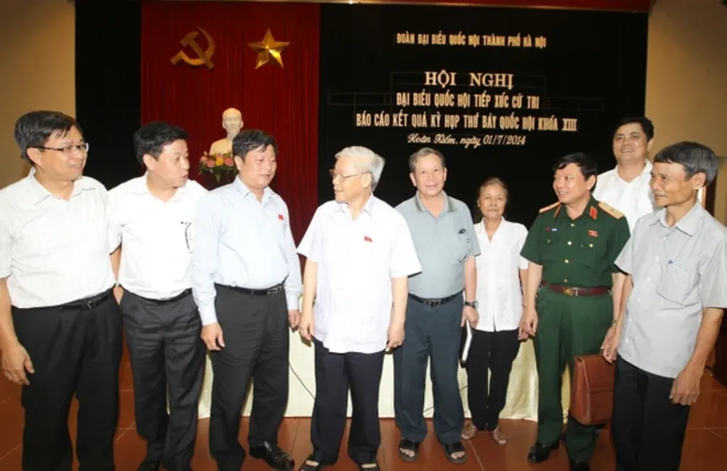 | Le secrétaire général Nguyên Phu Trong rencontre des électeurs de l’arrondissement de Hoàn Kiêm, Hanoï, le 1er juillet 2014. |
