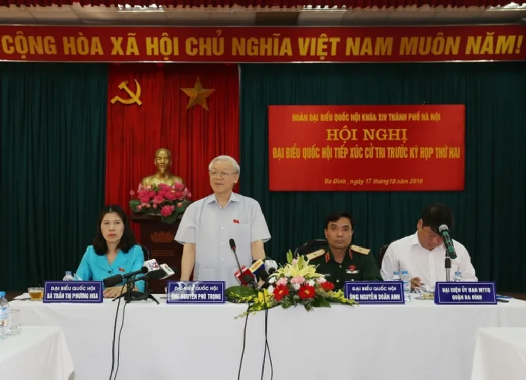 | Le secrétaire général Nguyên Phu Trong s’exprime lors de la rencontre avec des électeurs de l’arrondissement de Ba Dinh, Hanoï, avant la 2e session de la XIVe Assemblée nationale, 17 octobre 2016. |