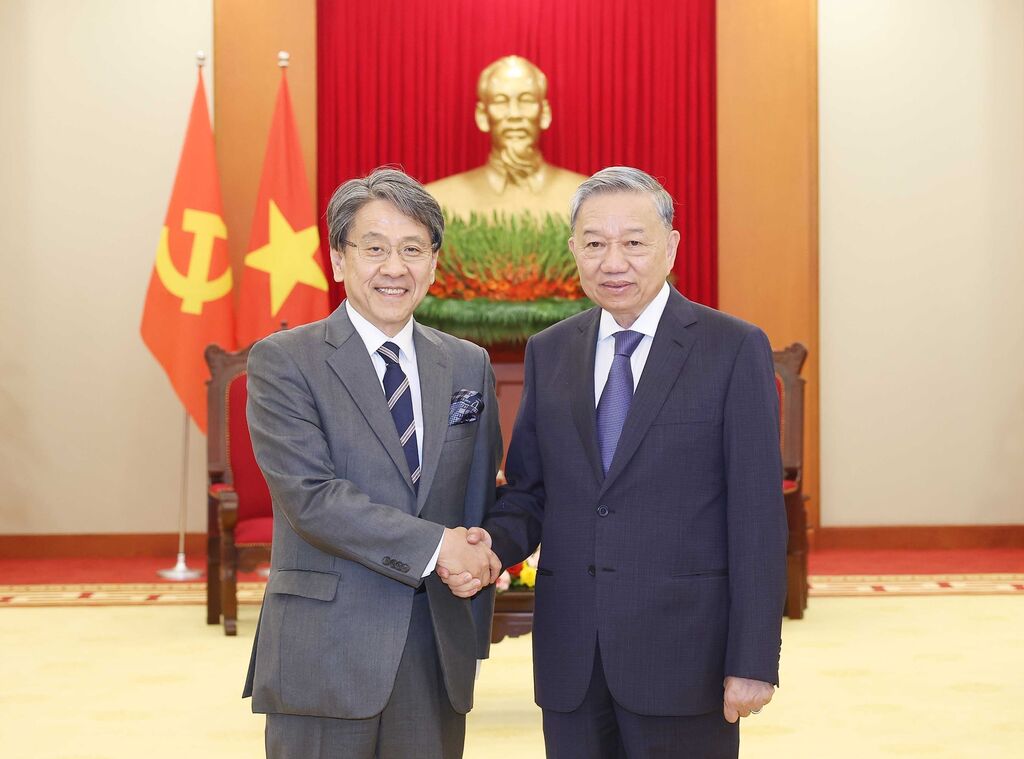 | Le secrétaire général du Parti communiste du Vietnam, Tô Lâm (droite), et le président du conseil d’administration de la Banque japonaise pour la coopération internationale, Maeda Tadashi. |