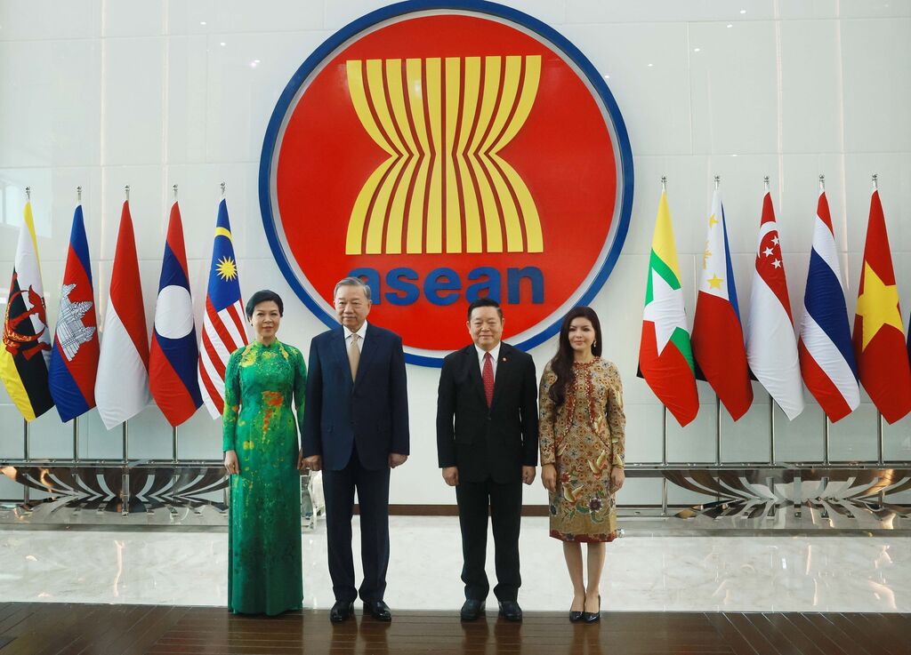 | Le secrétaire général du PCV, Tô Lâm (2e à gauche) et son épouse accueillis par le secrétaire général de l'ASEAN, le Dr. Kao Kim Hourn et son épouse, le 10 mars à Jakarta. |