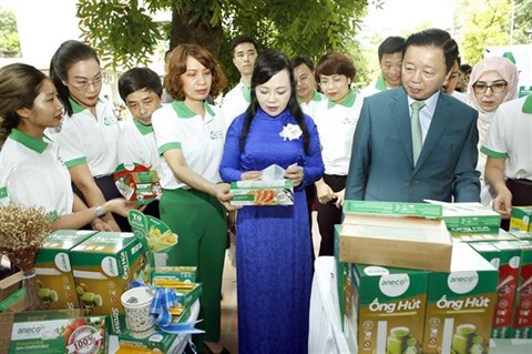 | La ministre de la Santé, Nguyên Thi Kim Tiên (centre), et le ministre des Ressources naturelles et de l'Environnement, Trân Hông Hà, visitent un stand qui expose des produits respectueux de l'environnement. |