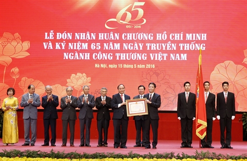 | Le Premier ministre Nguyên Xuân Phuc remet l’Ordre Hô Chi Minh au secteur de l'industrie et du commerce, le 15 mai à Hanoi. |