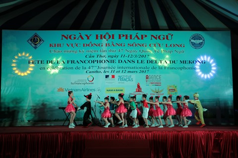 | Une interprétation de jeunes élèves lors de la célébration de la 47e Journée de la Francophonie dans le delta du Mékong. |