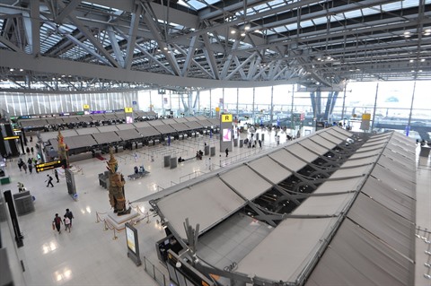 | Le hall de départ presque vide de l'aéroport Suvarnabhumi à Bangkok. |