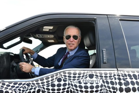 | Joe Biden conduit un véhicule électrique, le Ford F-150, à Dearborn, dans le Michigan le 18 mai 2021. |