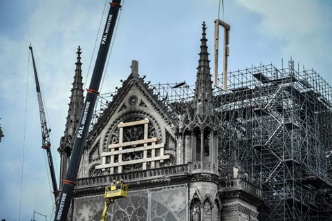 | Des échafaudages installés sur Notre-Dame gravement endommagée par un incendie, le 7 mai à Paris. |