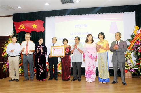 | Le directeur général de l'Agence Vietnamienne d'Information, Nguyên Duc Loi, remet le satisfecit du Premier ministre à Mme Nguyên Thu Hà, rédactrice en chef du Courrier du Vietnam. |