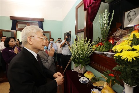 | Le secrétaire général du Parti communiste et président du Vietnam Nguyên Phu Trong offre de l'encens à la mémoire du Président Hô Chi Minh dans la maison 67. |
