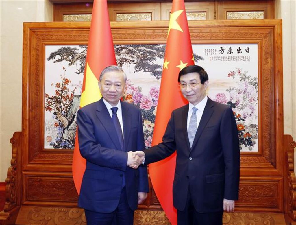 | Le secrétaire général du Parti communiste du Vietnam (PCV) et président vietnamien, Tô Lâm (gauche), et Wang Huning, président du Comité national de la Conférence consultative politique du peuple chinois (CCPPC). |