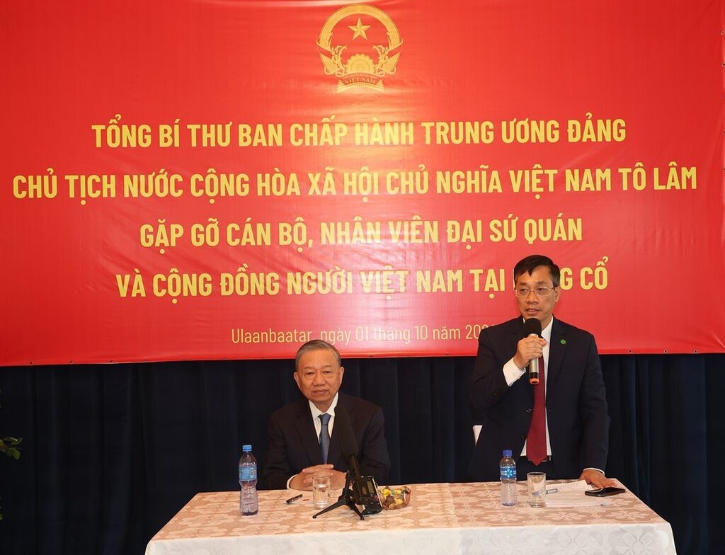 | L'ambassadeur Nguyên Tuân Thanh prenant la parole lors de la visite du dirigeant Tô Lâm à l'ambassade du Vietnam en Mongolie. |