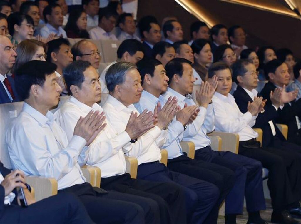 | Le secrétaire général du Parti communiste du Vietnam et président Tô Lâm (3e, gauche) lors du spectacle "La Patrie dans le cœur", le soir du 9 avril à Hanoï. |
