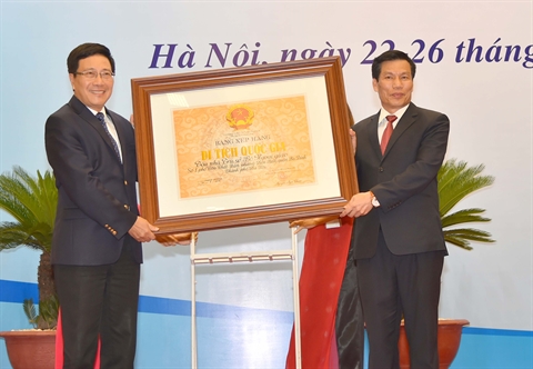 | Pham Binh Minh (gauche) et Nguyên Ngoc Thiên tiennent le certificat reconnaissant le siège du ministère des Affaires étrangères à Hanoi en tant que patrimoine national. |