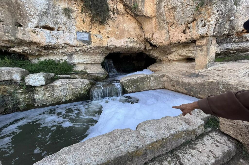 | De l'eau recouverte de mousse s'échappe de la Fontaine d'Apollon, sur le site antique de Cyrène, dans l'est de la Libye, fragilisé par les inondations du 10 septembre. |