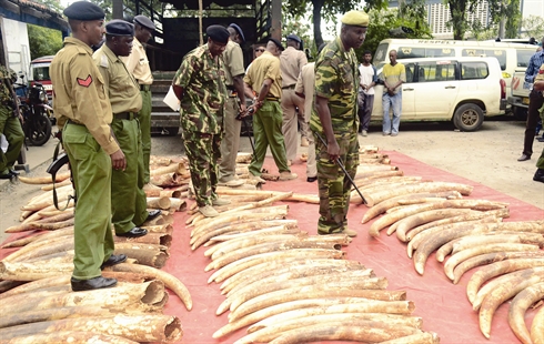| La police kenyane présente 302 pièces d’ivoire, dont 228 défenses d’éléphants, saisies au port de Mombasa. |