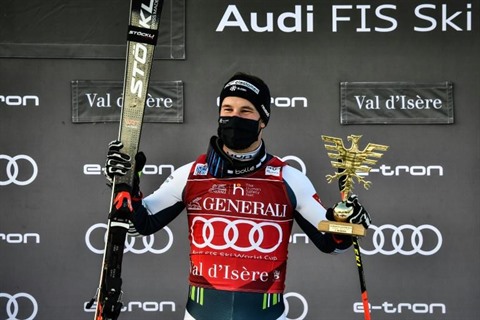 | Le Slovène Martin Cater célèbre sa victoire dans la descente de Coupe du monde, le 13 décembre à Val d'Isère. |
