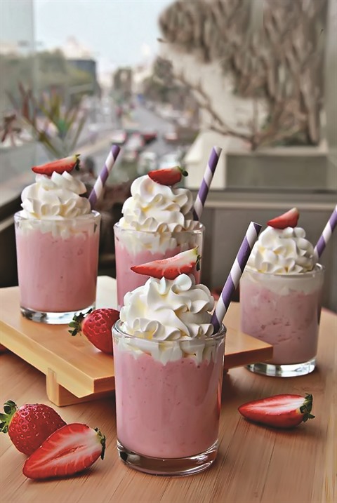 - Verser le smoothie dans les verres, utiliser une poche à douille pour donner forme à la crème chantilly sur la surface du smoothie. Décorer la boisson avec les fraises.