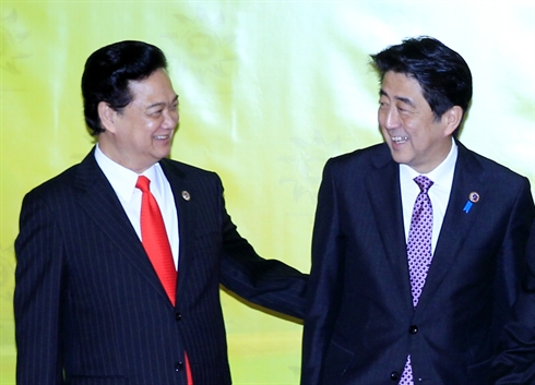 | Le Premier ministre vietnamien, Nguyên Tân Dung (gauche), et son homologue japonais, Shinzo Abe, le 9 octobre à Bandar (Brunei) |