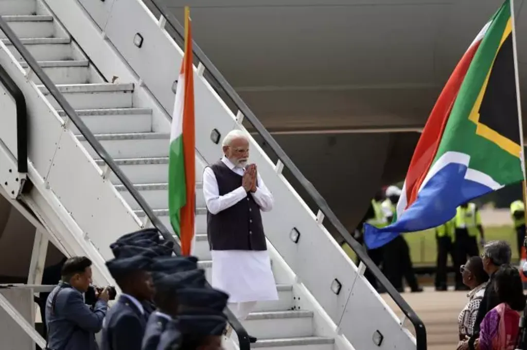 | Le Premier ministre indien Narendra Modi réagit à son arrivée à la base aérienne de Waterkloof à Pretoria, le 21 novembre, à la veille d'un Sommet des dirigeants du G20 en Afrique du Sud. |