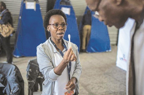 | Présentation d’un test d’autodépistage du VIH à des habitants du quartier pauvre au centre de Johannesburg, en Afrique du Sud. |