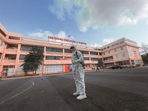 | Ngô Gia Long, en combinaison de protection, dans un centre de confinement à Bac Giang (Nord). |