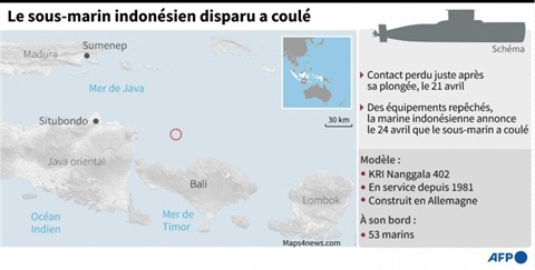 | Carte et données sur le sous-marin qui a coulé au large de Bali avec 53 personnes à son bord le 21 avril. |