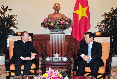 | Le vice-Premier ministre et ministre des Affaires étrangères Pham Binh Minh (droite) et le sous-secrétaire du Vatican pour les relations avec les États, Mgr. Antoine Camilleri, le 18 janvier à Hanoï. |
