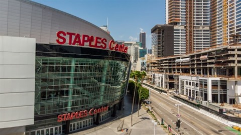 | Vue aérienne du Staples Center, la salle omnisports de Los Angeles où évoluent les équipes de basket des Clippers et des Lakers, ainsi que la franchise de hockey sur glace des Kings, le 9 mai. |