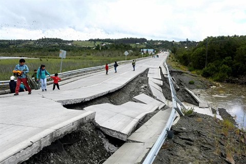 | Une portion d'autoroute endommagée après un puissant séisme sur l'île de Chiloé, à quelque 1.000 km au sud de la capitale Santiago, le 25 décembre. |