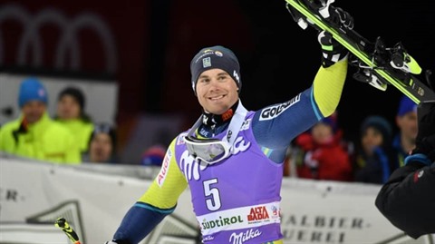 | La joie du Suédois, Matts Olsson, après sa victoire au géant parralèle d'Alta Badia en Italie, le 18 décembre. |