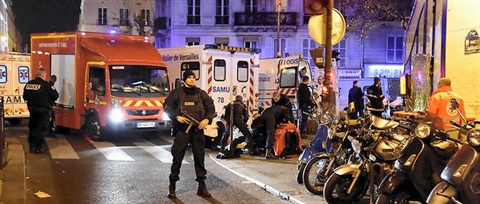 | Des forces de l'ordre près de la salle de concert du Bataclan. |