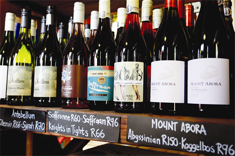 | Des bouteilles de vin du Swartland vendues dans une coopérative de Riebeek Kasteel, en Afrique du Sud. |
