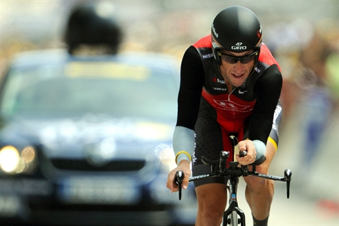 | L’Américain Lance Armstrong en compétition à la 19e étape du Tour de France, le 24 juillet en 2010. |