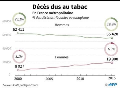 | Évolution des décès attribuables au tabagisme de 2000 à 2015 en milliers, pour les hommes et les femmes selon l'agence sanitaire Santé publique France. |