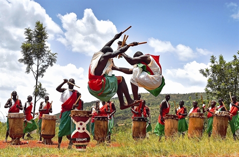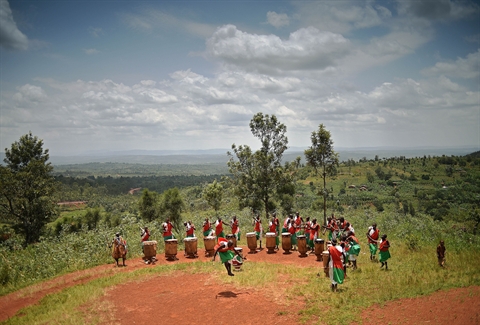| Le groupe de tambourinaires de Gishora est en démonstration en haut de la colline éponyme dans la province de Gitega au Burundi. |
