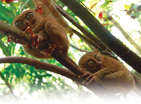 | Deux tarsiers accrochés à une branche sur l’île de Bohol aux Philippines. |