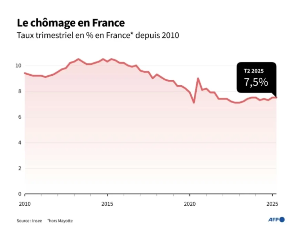 | Le taux de chômage en France s'établit à 7,5% au deuxième trimestre 2025, a indiqué l'Insee. |