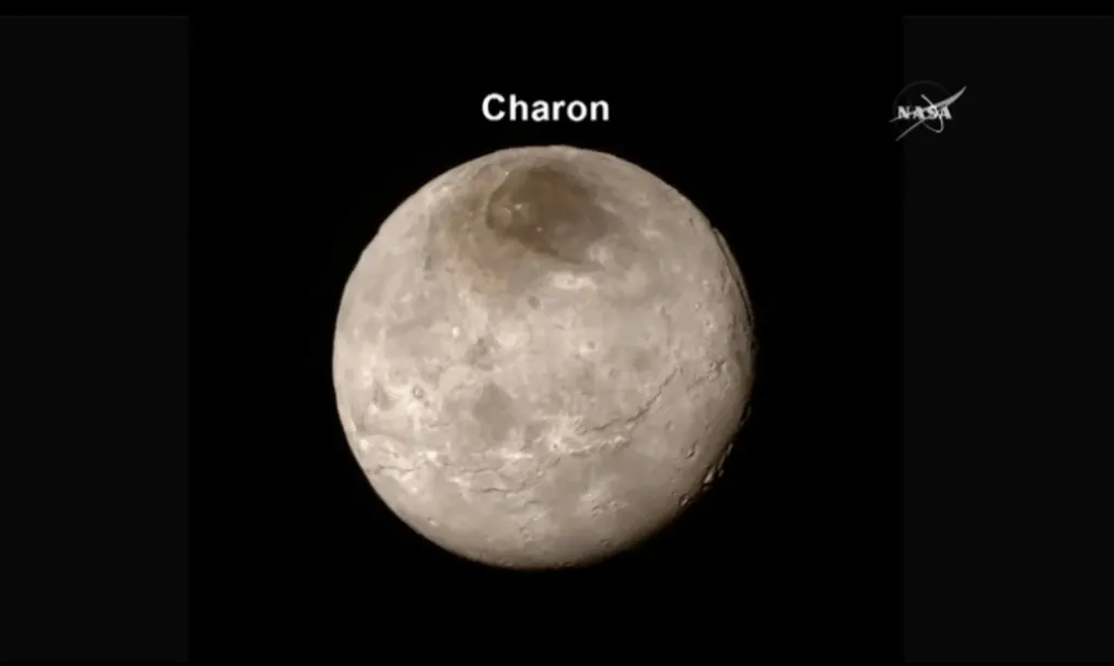 Charon, la plus grande des cinq lunes de Pluton, avec un diamètre d'environ 1.100 km, a été découverte en 1978. En la survolant en 2015, la sonde New Horizons de la NASA a montré une surface couverte de glace d'eau et d'ammoniaque, supposées lui donner un aspect rouge et gris. Elle a aussi montré des remontées de matière depuis le sous-sol.