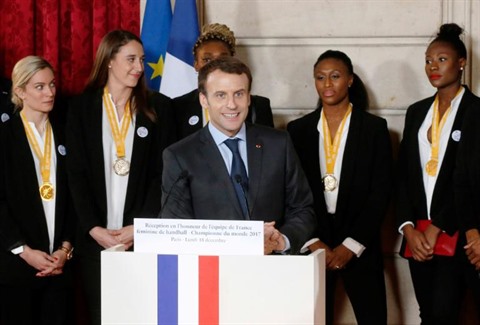 | Le président Emmanuel Macron (centre) rend hommage aux handballeuses françaises championnes du monde lors d'une allocution au Palais de l'Élysée, le 18 décembre. |