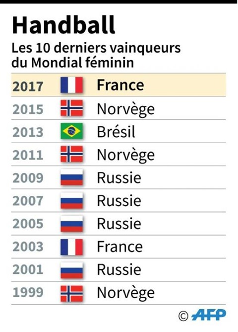 | Les 10 derniers vainqueurs du championnant du monde de handball féminin. |